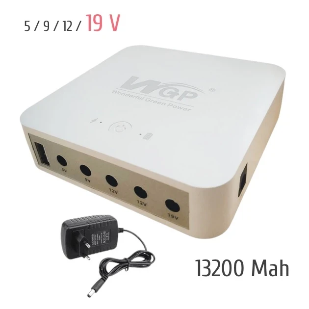 - ДБЖ WGP обладнаний акумуляторною батареєю на 13200 mAh, що дає змогу живити один малопотужний W-Fi роутер до 24 годин;